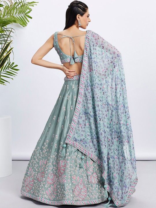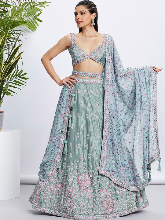 Lime green and pink embroidered lehenga choli with dupatta, sequinned